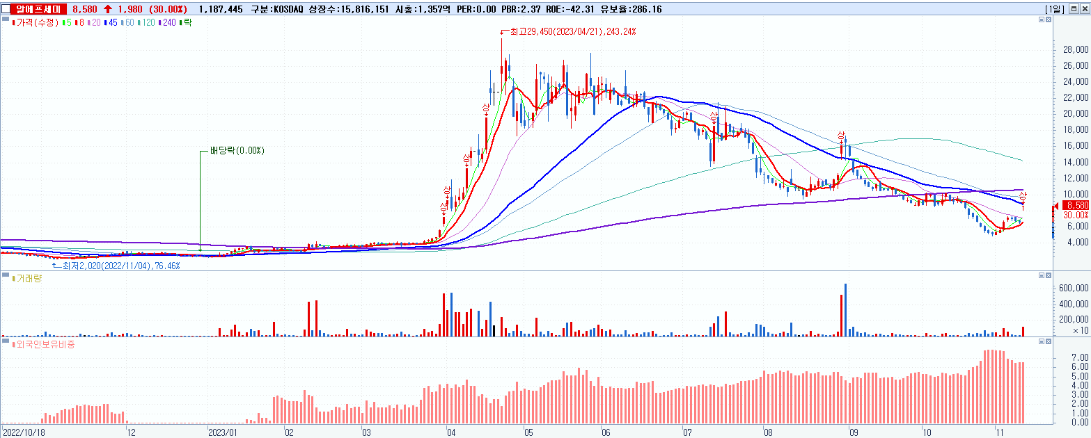 - 알에프세미 (8,580원 ▲ 30% , 시총: 1,357억, 거래량: 1,187,446, 거래대금:101억)