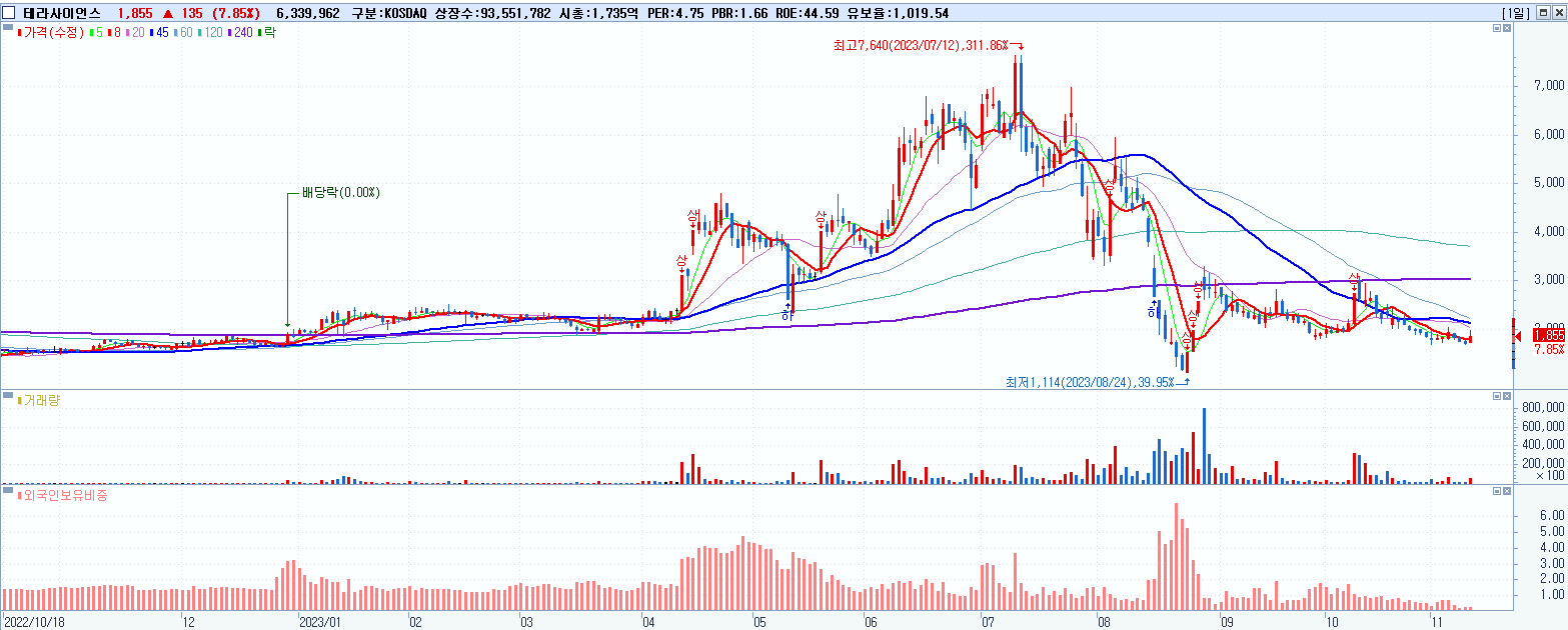 - 테라사이언스 (1,855원 ▲ 7.85% , 시총: 1,735억, 거래량: 6,340,656, 거래대금:119억)