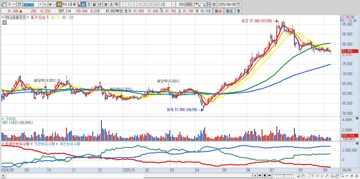 - 하나금융지주 (81,500원 ▲ 0.37% , 시총: 232,050억, 외국인 순매수 거래금:59억)