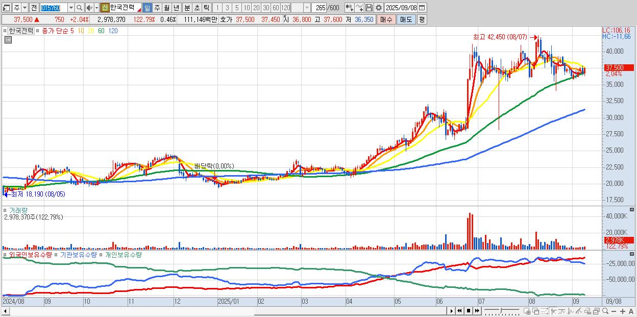 - 한국전력 (37,600원 ▲ 2.31% , 시총: 241,378억, 외국인 순매수 거래금:338억)