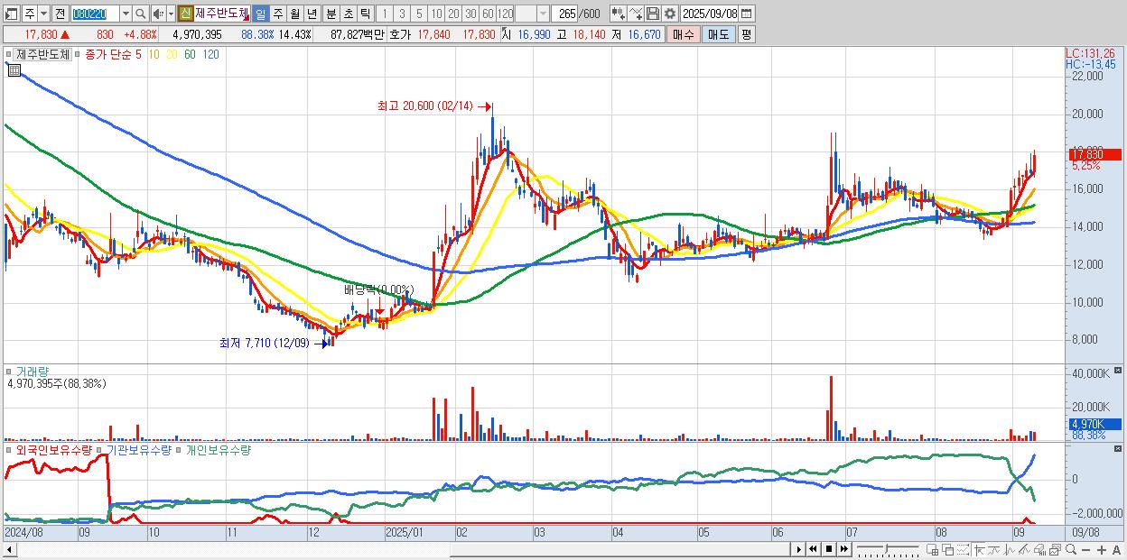 - 제주반도체 (17,710원 ▲ 4.18% , 시총: 6,100억, 외국인 순매수 거래금:93억)