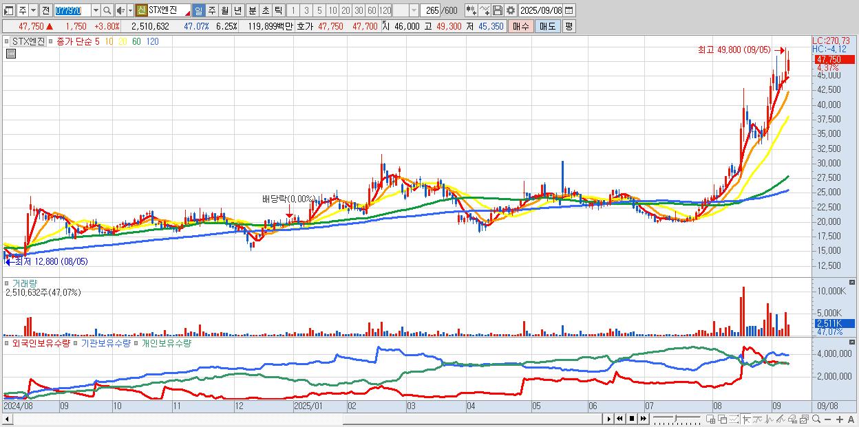 - STX엔진 (47,550원 ▲ 3.37% , 시총: 19,090억, 외국인 순매수 거래금:61억)