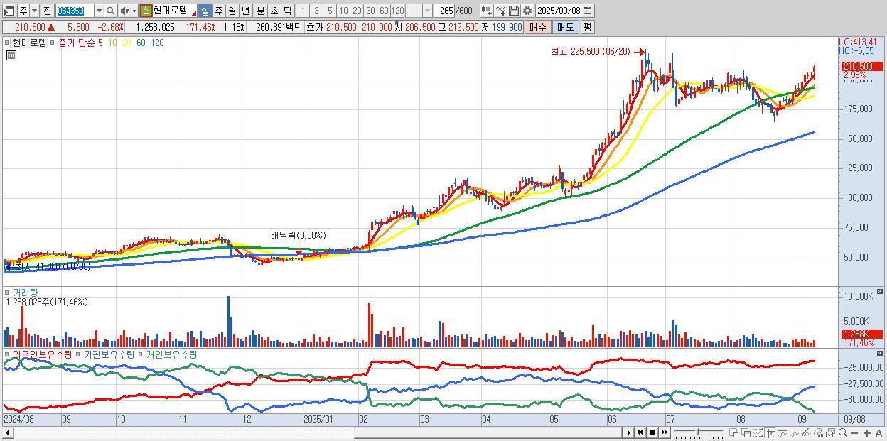 - 현대로템 (210,500원 ▲ 2.68% , 시총: 229,745억, 외국인 순매수 거래금:333억)