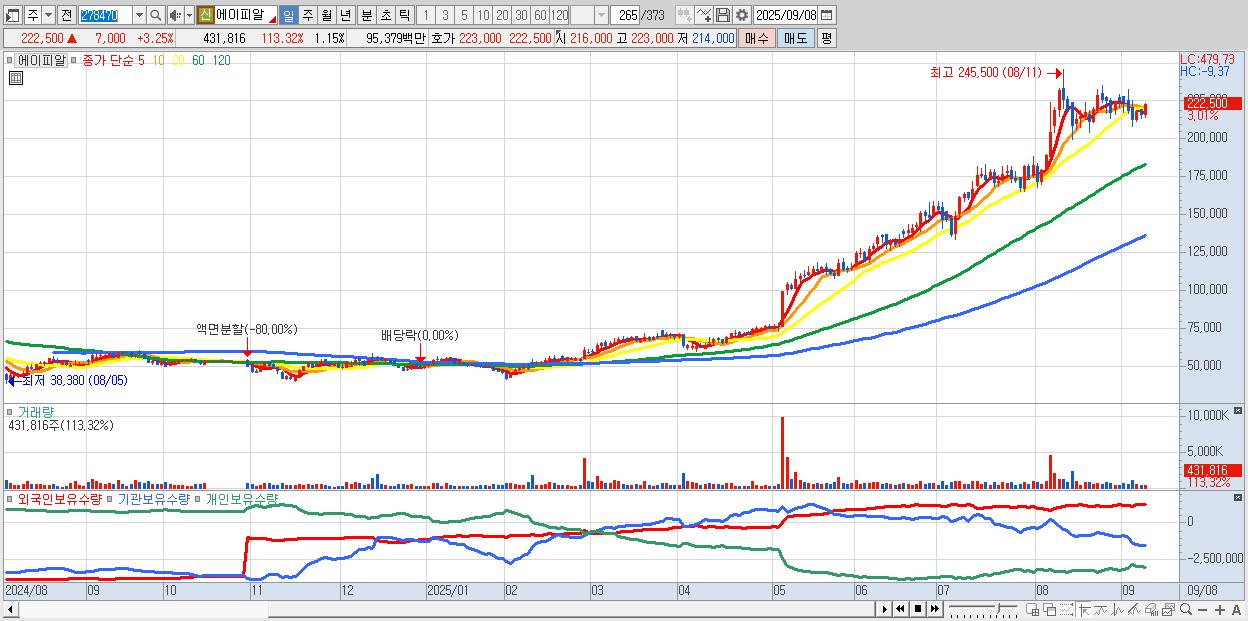 - 에이피알 (223,000원 ▲ 3.48% , 시총: 83,470억, 외국인 순매수 거래금:169억)