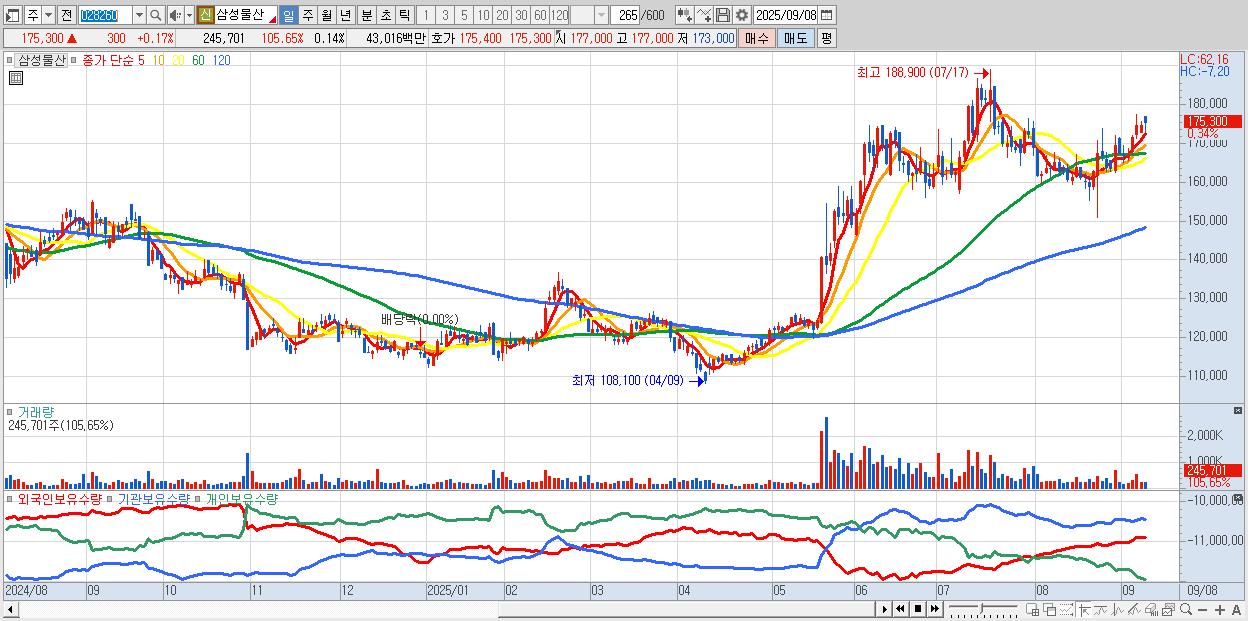 - 삼성물산 (175,200원 ▲ 0.11% , 시총: 297,799억, 외국인 순매수 거래금:81억)