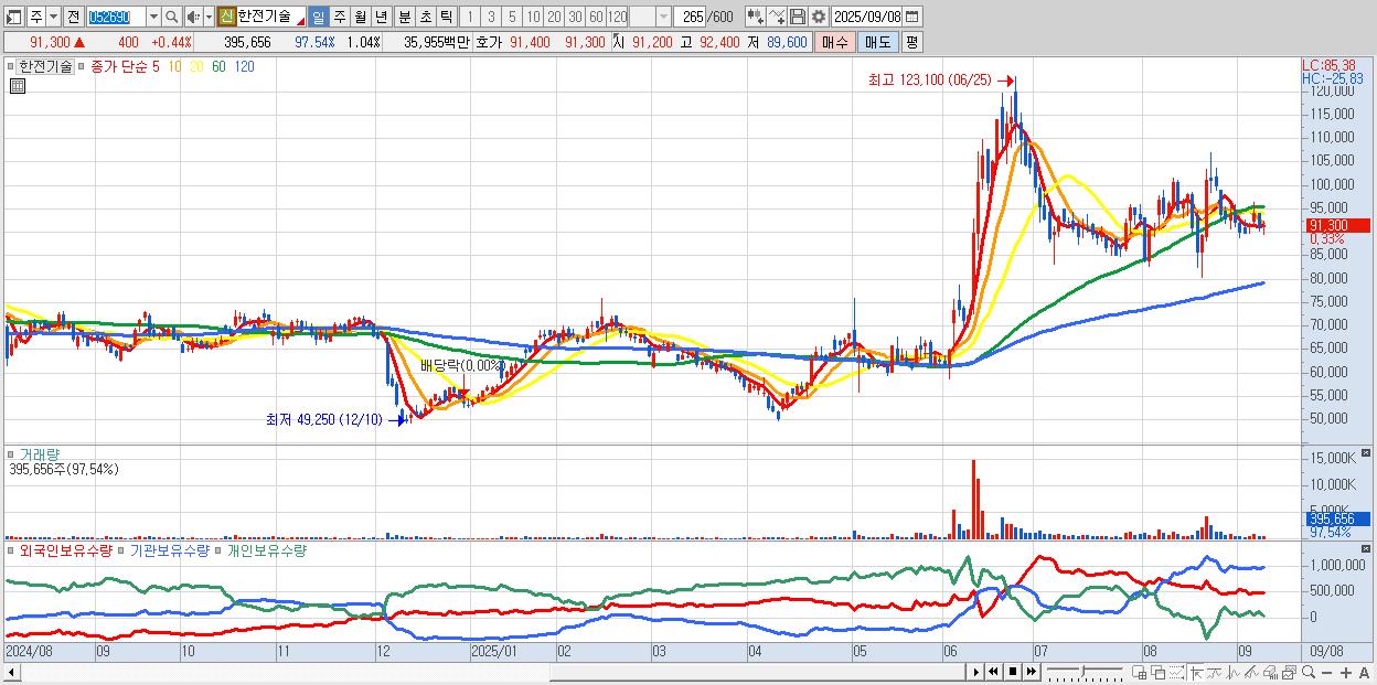 - 한전기술 (91,400원 ▲ 0.55% , 시총: 34,933억, 외국인 순매수 거래금:53억)