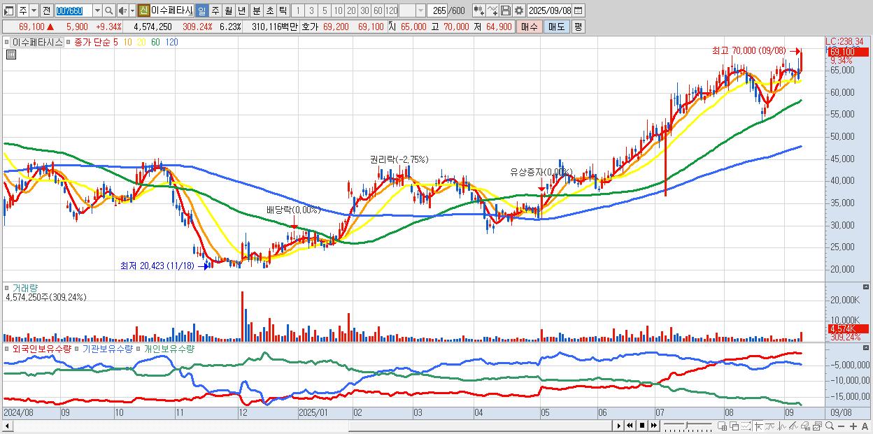 - 이수페타시스 (69,100원 ▲ 9.34% , 시총: 50,726억, 외국인 순매수 거래금:520억)