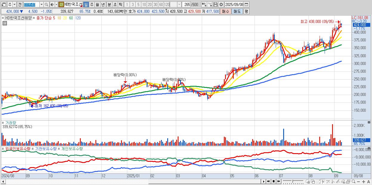 - HD한국조선해양 (424,500원 ▼ -0.93% , 시총: 300,432억, 외국인 순매수 거래금:143억)