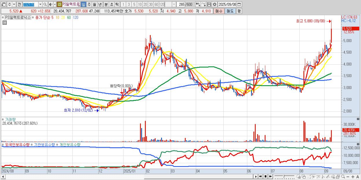 - PS일렉트로닉스 (5,520원 ▲ 12.65% , 시총: 2,388억, 외국인 순매수 거래금:54억)