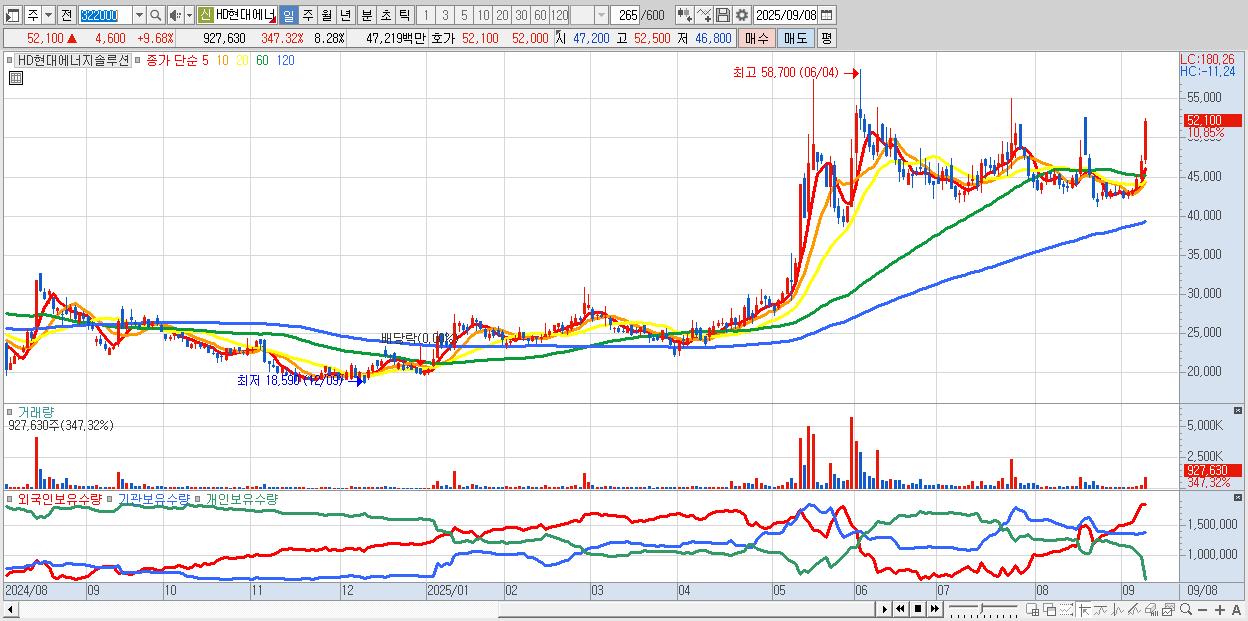 - HD현대에너지솔루션 (52,400원 ▲ 10.32% , 시총: 5,869억, 외국인 순매수 거래금:188억)