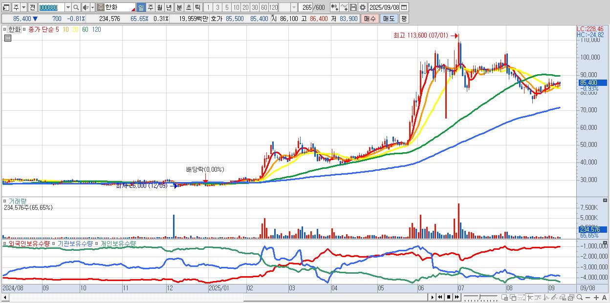 - 한화 (85,600원 ▼ -0.58% , 시총: 64,165억, 외국인 순매수 거래금:53억)