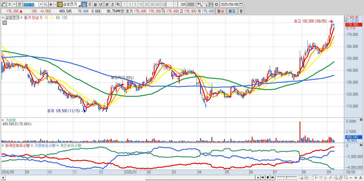 - 삼성전기 (178,700원 ▲ 0.28% , 시총: 133,478억, 외국인 순매수 거래금:82억)