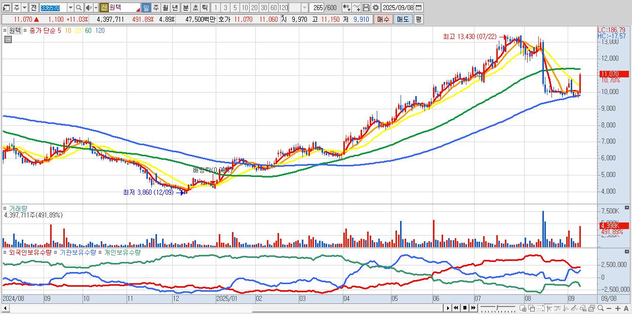 - 원텍 (11,060원 ▲ 10.93% , 시총: 9,951억, 외국인 순매수 거래금:58억)