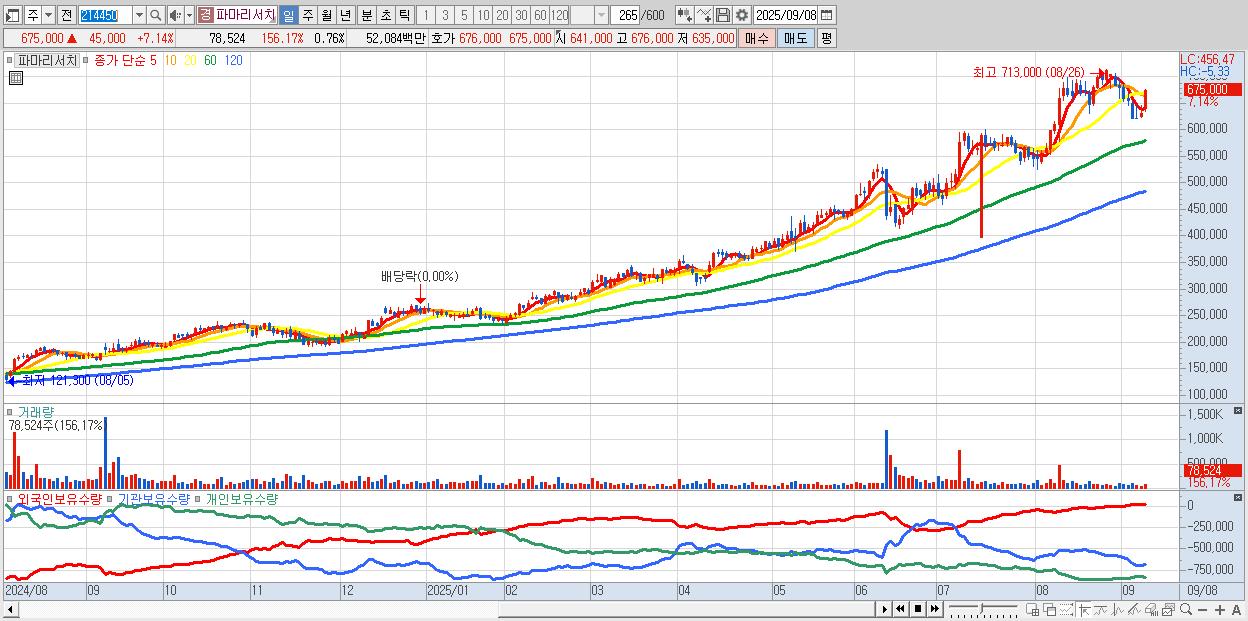 - 파마리서치 (675,000원 ▲ 7.14% , 시총: 70,130억, 외국인 순매수 거래금:56억)