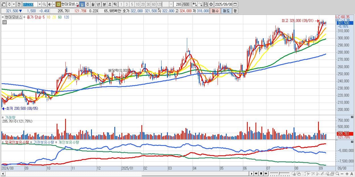 - 현대모비스 (323,000원 0% , 시총: 296,498억, 외국인 순매수 거래금:147억)