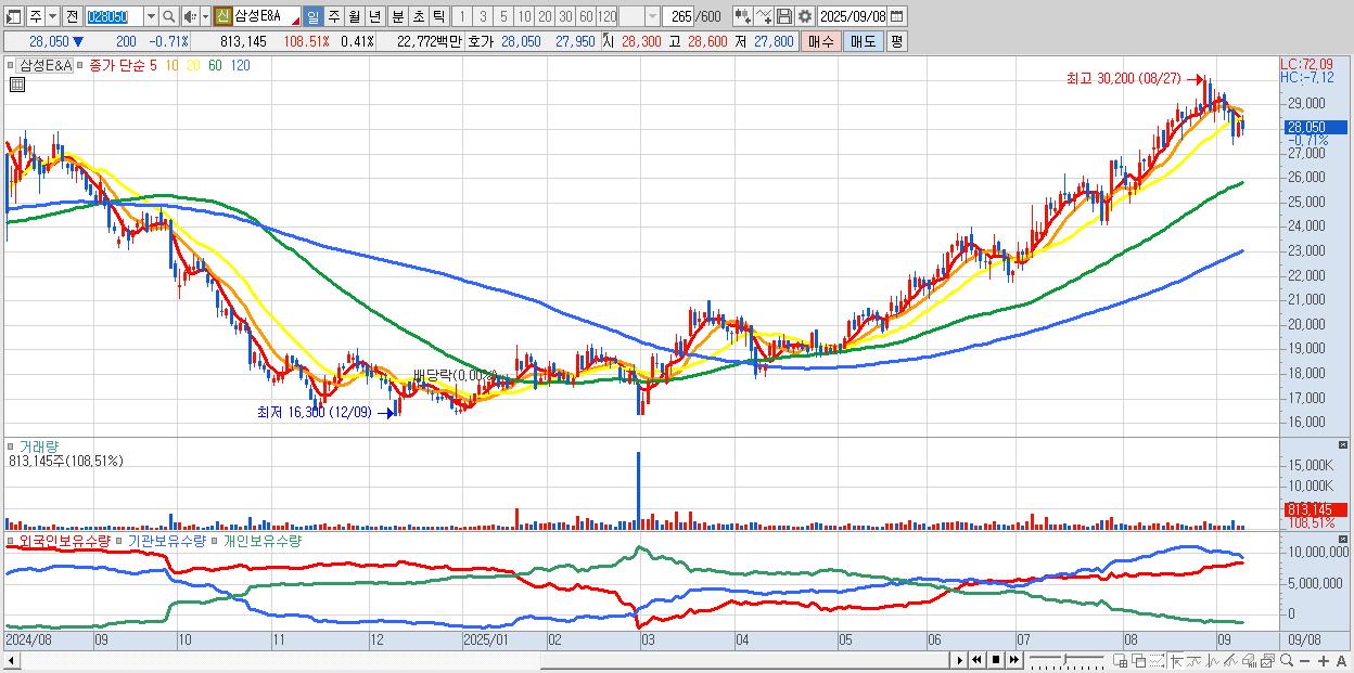 - 삼성E&A (28,000원 ▼ -0.88% , 시총: 54,880억, 외국인 순매수 거래금:68억)