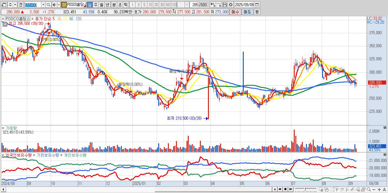 - POSCO홀딩스 (279,500원 ▲ 1.08% , 시총: 226,208억, 외국인 순매수 거래금:176억)