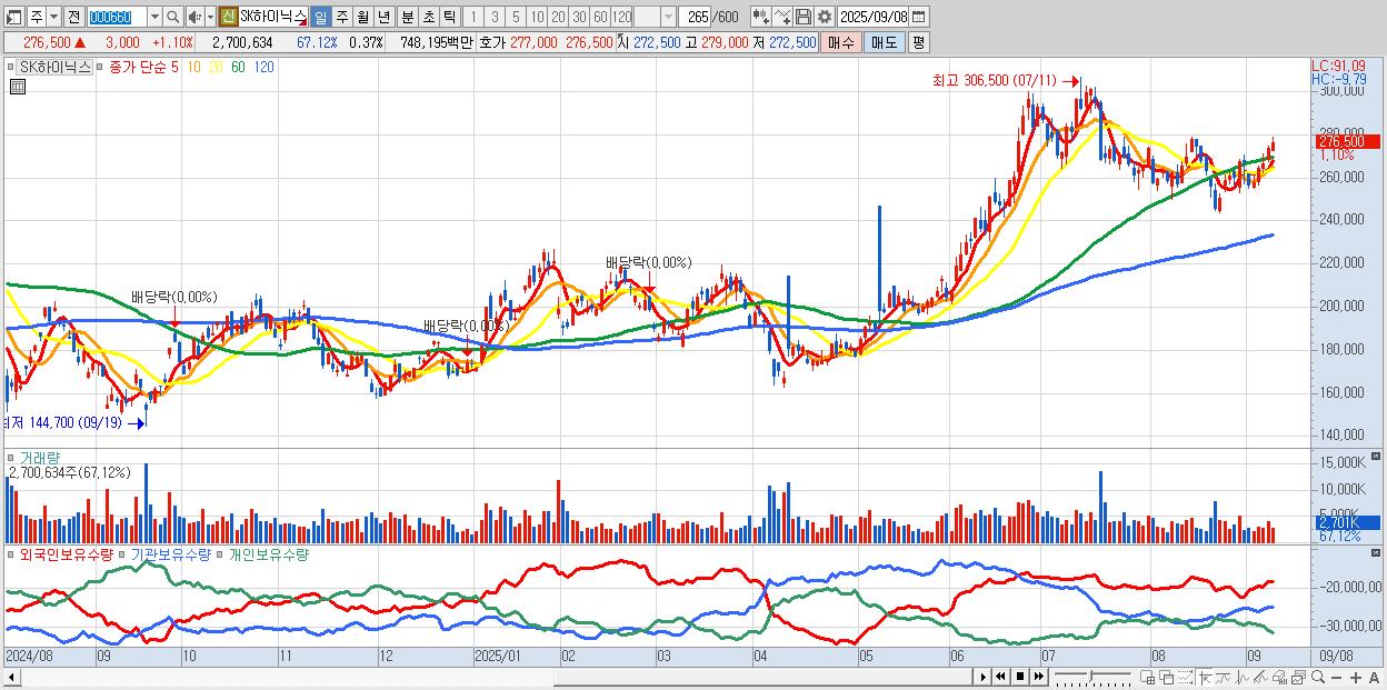 - SK하이닉스 (277,000원 ▲ 1.28% , 시총: 2,016,567억, 외국인 순매수 거래금:1,481억)