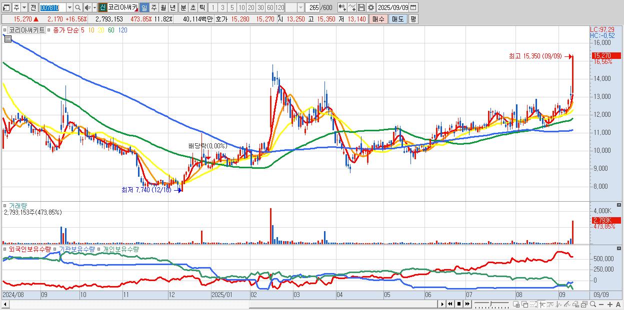- 코리아써키트 (15,130원 ▲ 15.5% , 시총: 3,574억, 거래량: 1,392,291, 거래대금:200억)