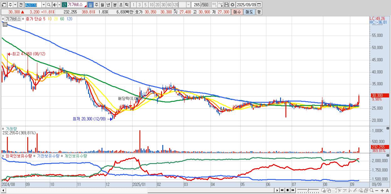 - 기가비스 (30,800원 ▲ 13.65% , 시총: 3,904억, 거래량: 145,933, 거래대금:43억)