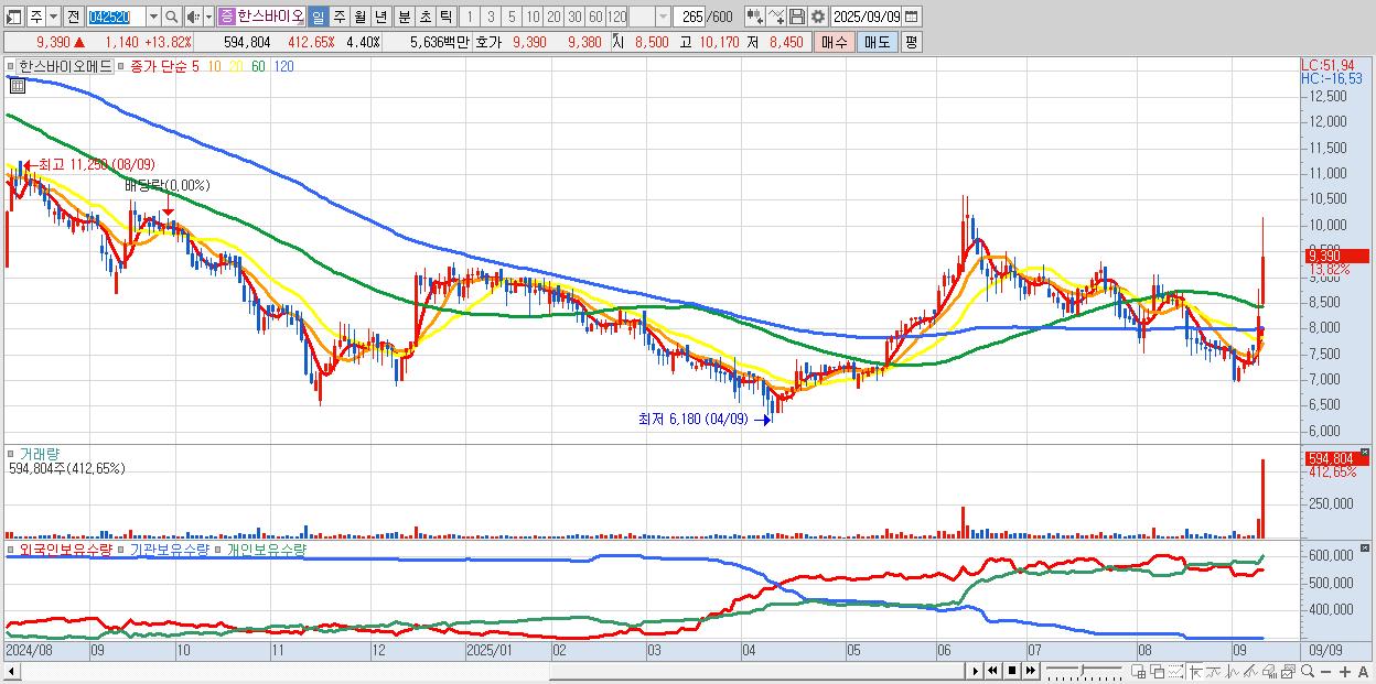 - 한스바이오메드 (9,390원 ▲ 13.82% , 시총: 1,270억, 거래량: 594,804, 거래대금:56억)