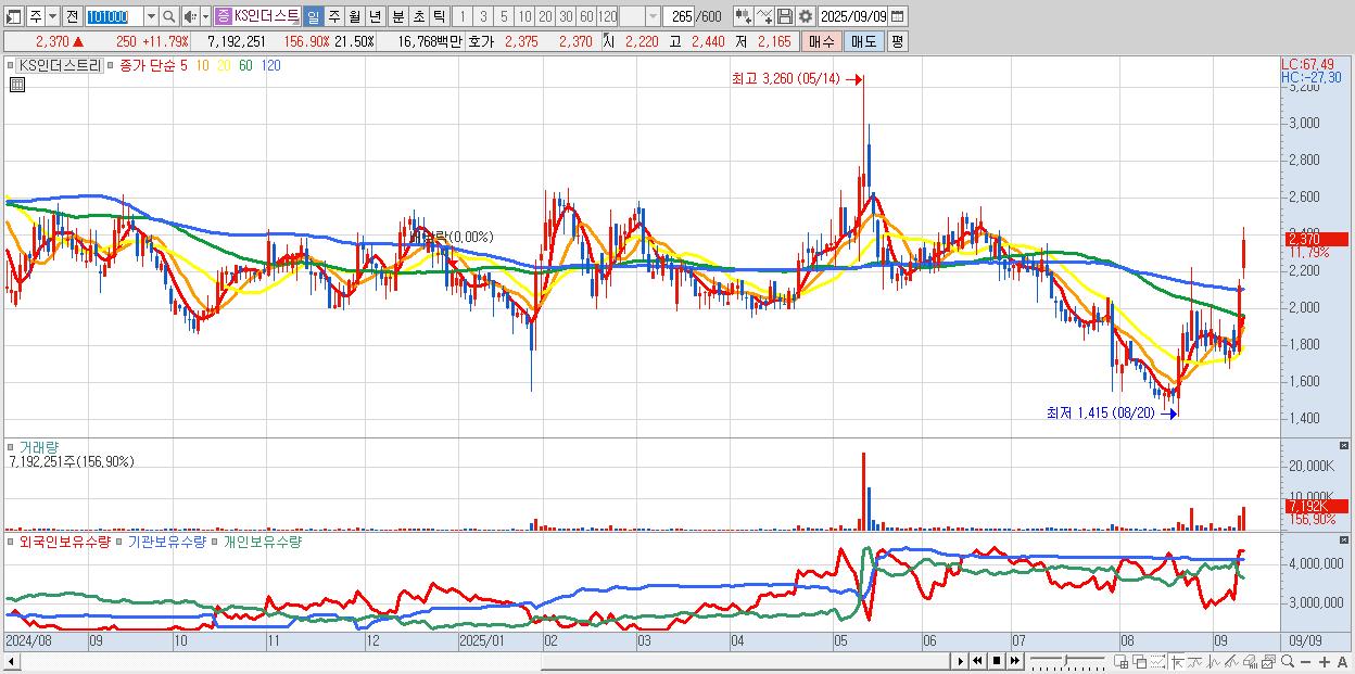 - KS인더스트리 (2,370원 ▲ 11.79% , 시총: 793억, 거래량: 7,192,251, 거래대금:168억)
