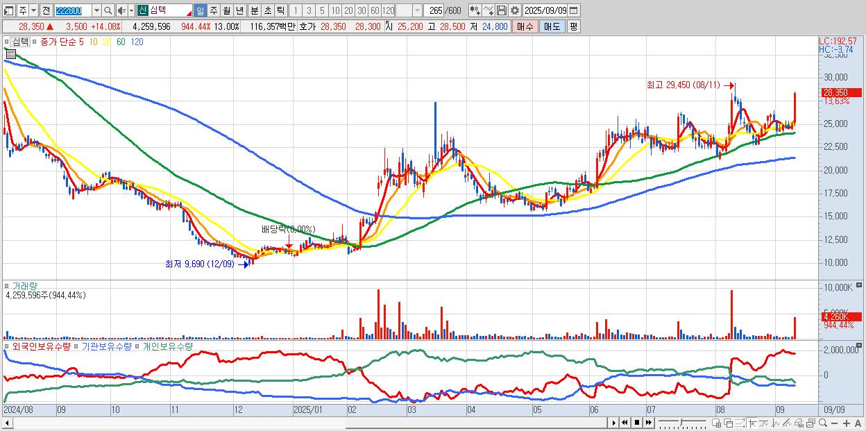 - 심텍 (28,350원 ▲ 14.08% , 시총: 9,290억, 거래량: 2,441,977, 거래대금:668억)