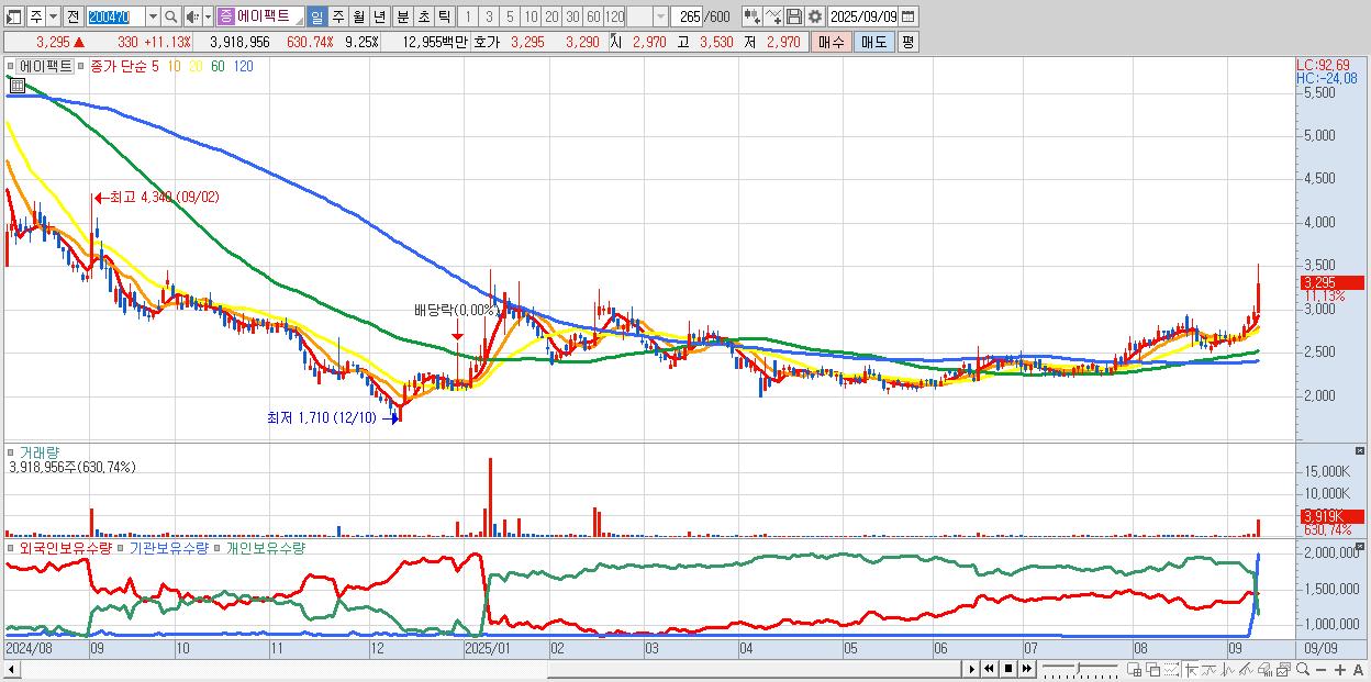 - 에이팩트 (3,295원 ▲ 11.13% , 시총: 1,396억, 거래량: 3,918,956, 거래대금:130억)
