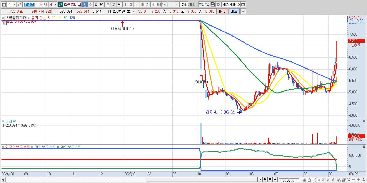 - 초록뱀미디어 (7,210원 ▲ 14.99% , 시총: 1,763억, 거래량: 1,623,324, 거래대금:113억)