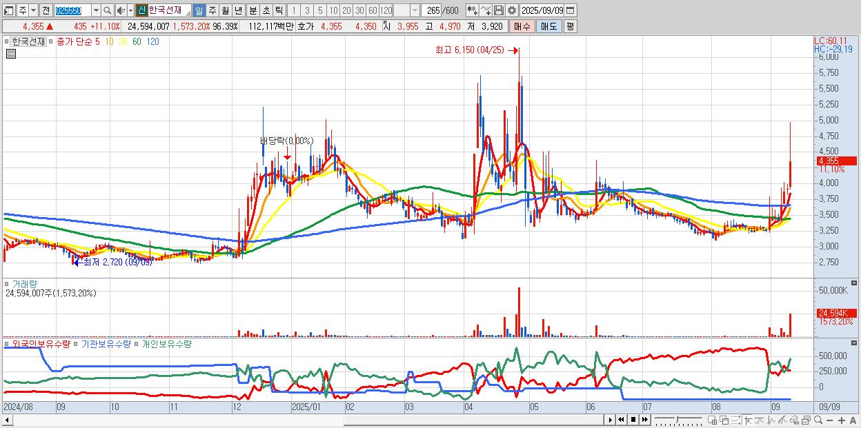 - 한국선재 (4,355원 ▲ 11.1% , 시총: 1,111억, 거래량: 24,594,007, 거래대금:1,121억)