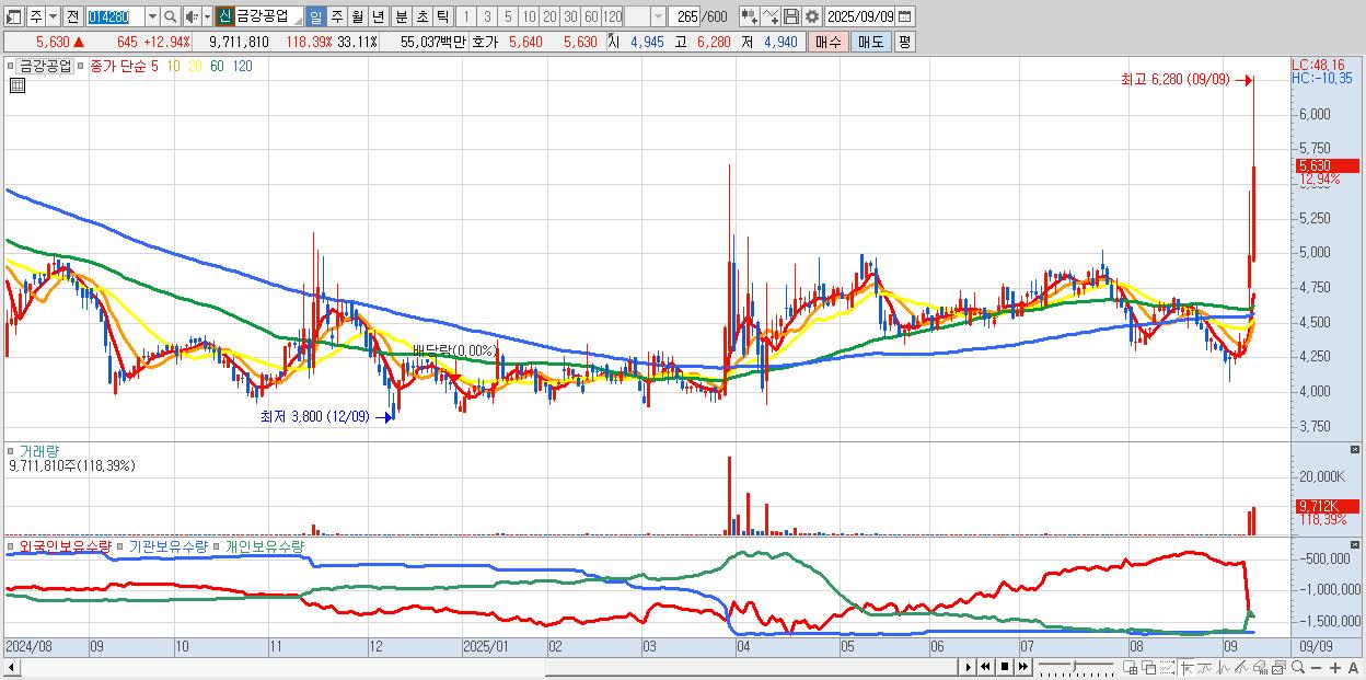 - 금강공업 (5,630원 ▲ 12.94% , 시총: 1,651억, 거래량: 9,711,810, 거래대금:550억)