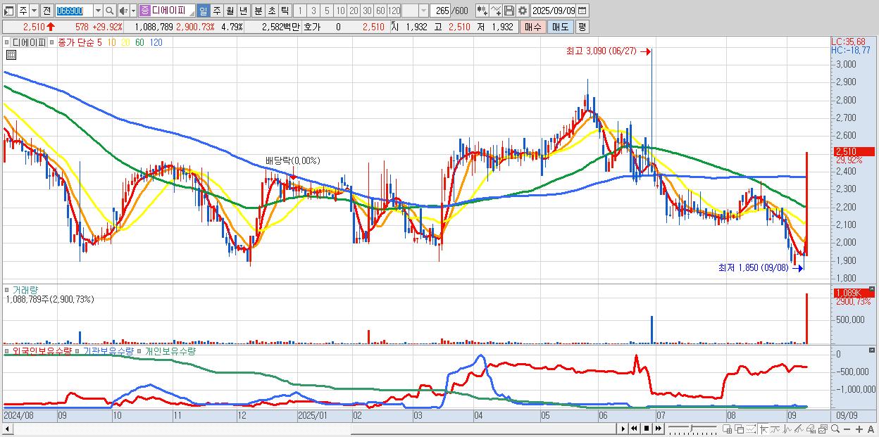 - 디에이피 (2,510원 ▲ 29.92% , 시총: 571억, 거래량: 1,088,789, 거래대금:26억)