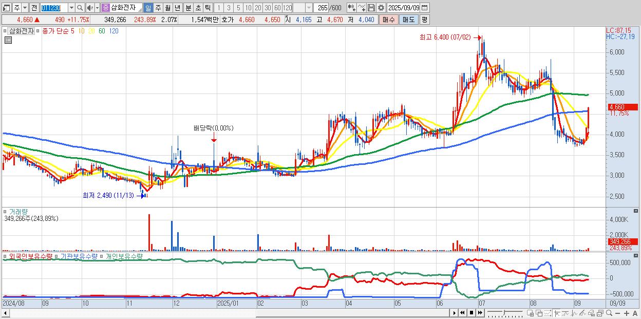 - 삼화전자 (4,660원 ▲ 11.75% , 시총: 788억, 거래량: 349,266, 거래대금:15억)