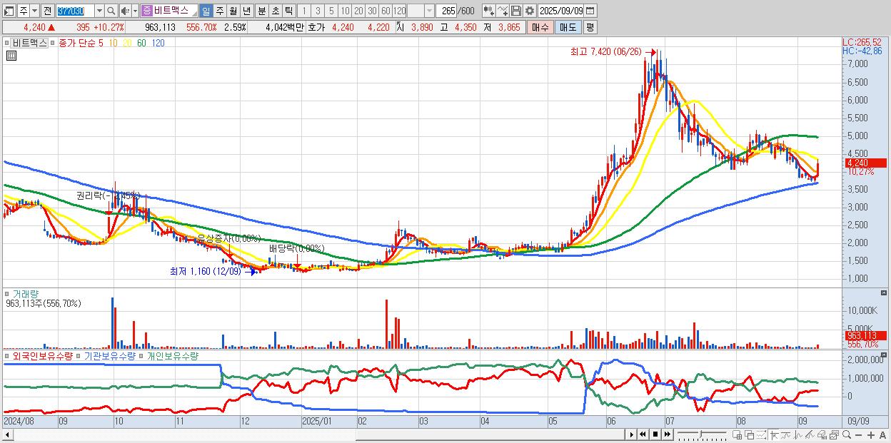 - 비트맥스 (4,240원 ▲ 10.27% , 시총: 1,579억, 거래량: 963,113, 거래대금:40억)