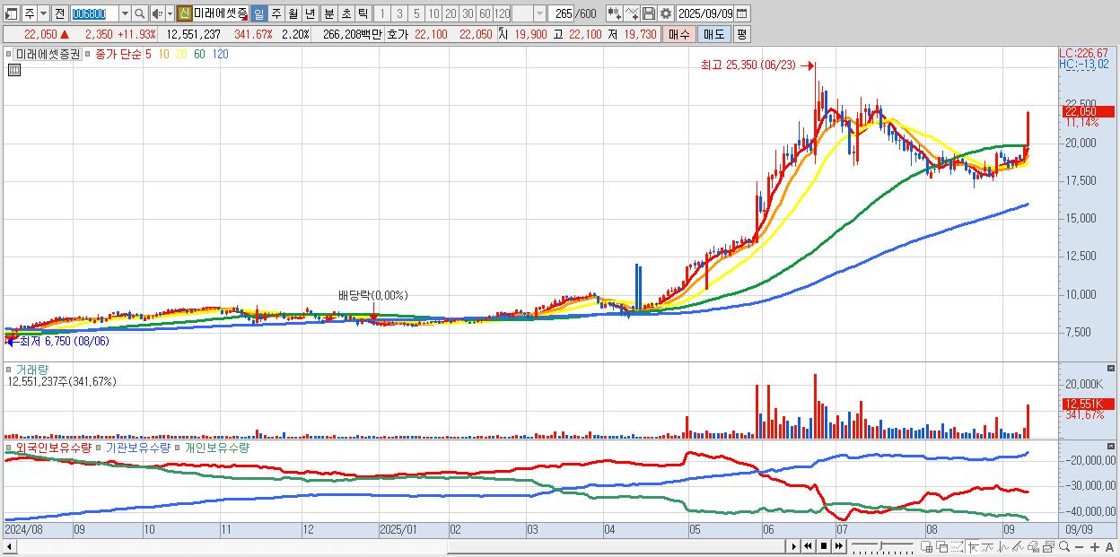 - 미래에셋증권 (22,000원 ▲ 11.68% , 시총: 125,470억, 거래량: 7,305,270, 거래대금:1,552억)