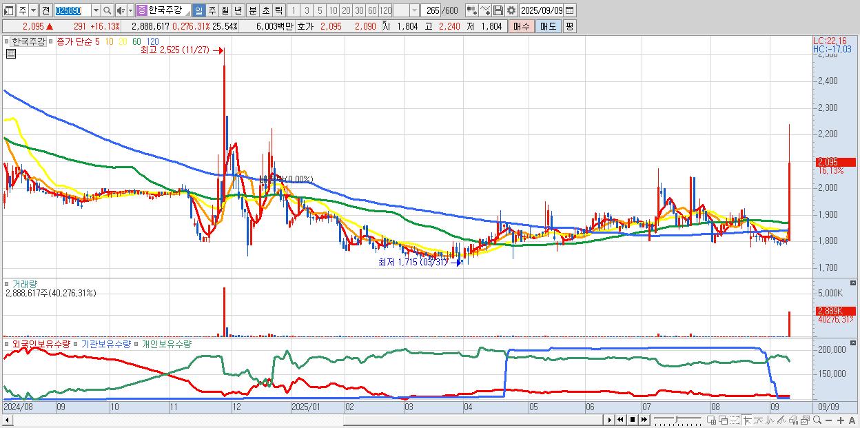 - 한국주강 (2,095원 ▲ 16.13% , 시총: 237억, 거래량: 2,888,617, 거래대금:60억)