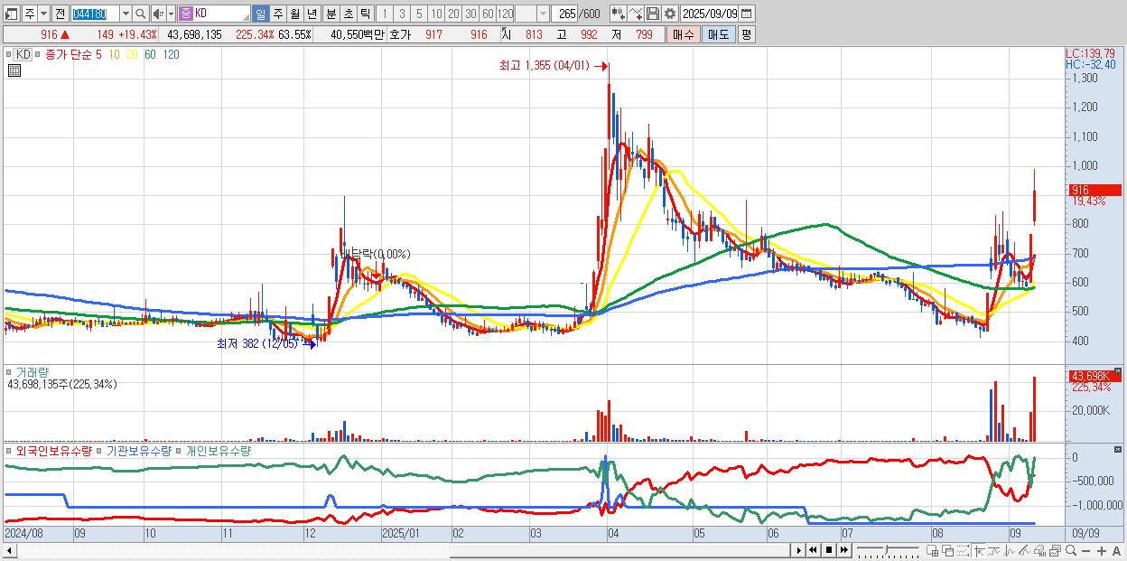 - KD (916원 ▲ 19.43% , 시총: 245억, 거래량: 43,698,135, 거래대금:406억)
