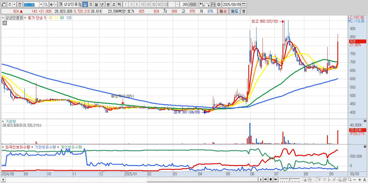 - 상상인증권 (824원 ▲ 21% , 시총: 893억, 거래량: 28,823,826, 거래대금:236억)
