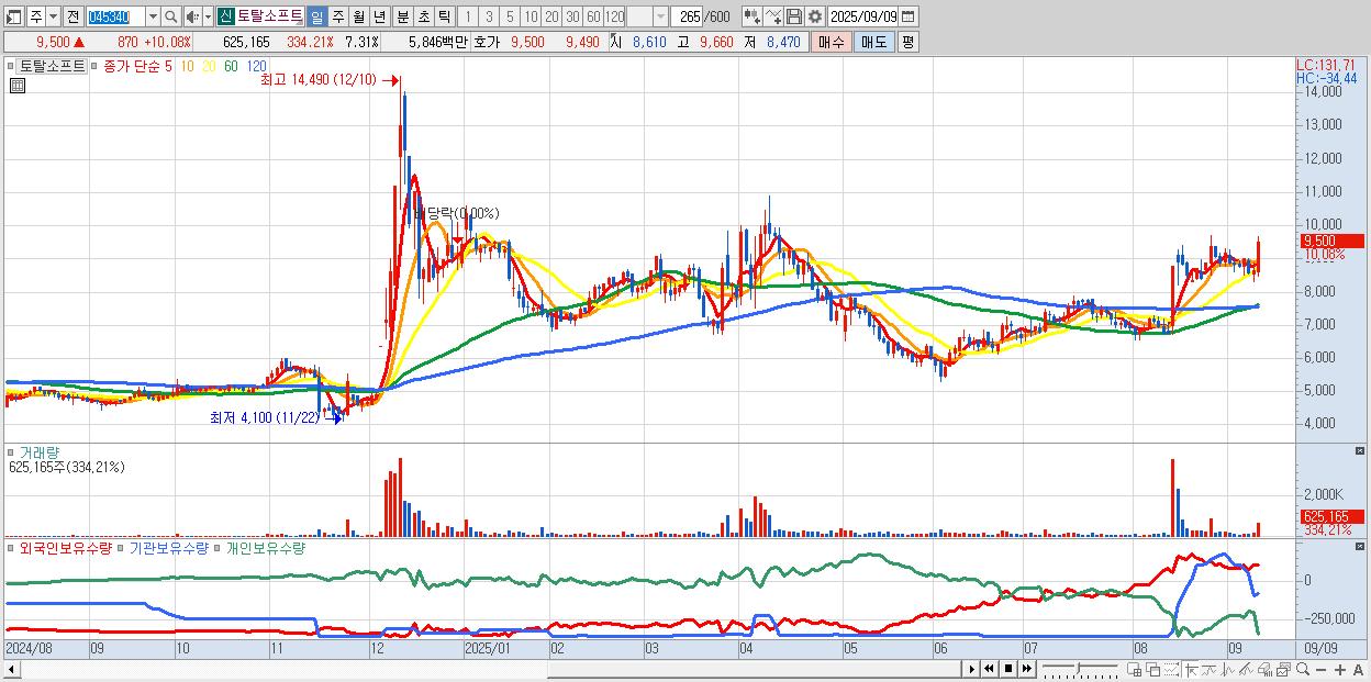 - 토탈소프트 (9,500원 ▲ 10.08% , 시총: 813억, 거래량: 625,165, 거래대금:58억)