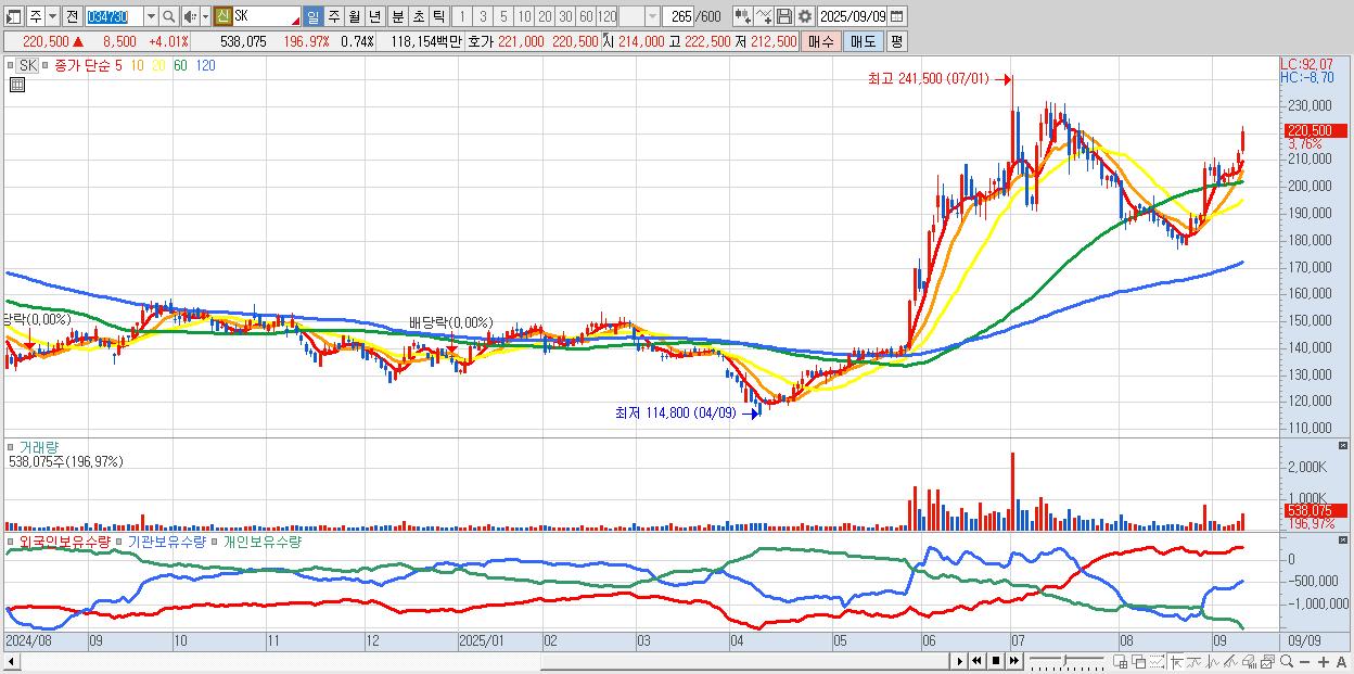 - SK (222,000원 ▲ 4.72% , 시총: 160,956억, 외국인 순매수 거래금:295억)