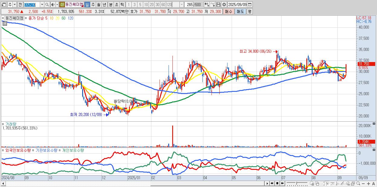 - 동진쎄미켐 (31,700원 ▲ 8.38% , 시총: 16,298억, 외국인 순매수 거래금:164억)