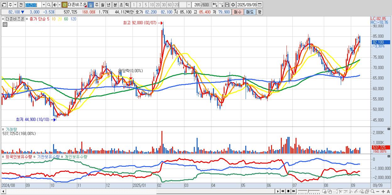 - 더존비즈온 (82,100원 ▼ -3.53% , 시총: 24,944억, 외국인 순매수 거래금:61억)