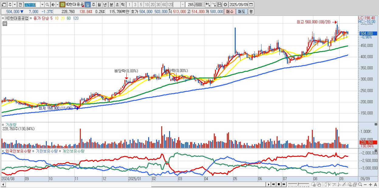 - HD현대중공업 (504,000원 ▼ -1.37% , 시총: 447,417억, 외국인 순매수 거래금:142억)