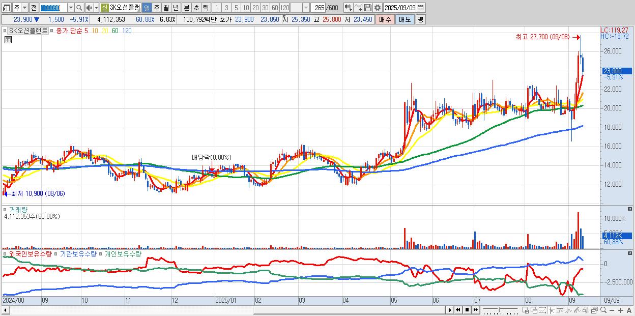- SK오션플랜트 (23,900원 ▼ -5.91% , 시총: 14,383억, 외국인 순매수 거래금:65억)