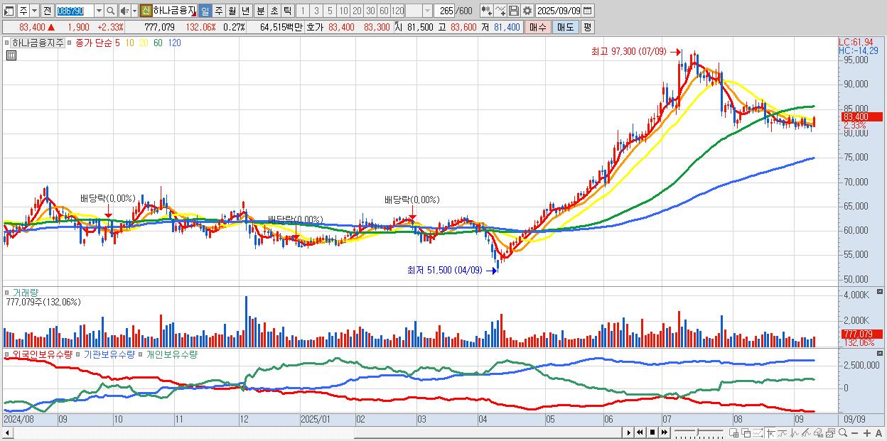 - 하나금융지주 (83,300원 ▲ 2.21% , 시총: 237,175억, 외국인 순매수 거래금:71억)