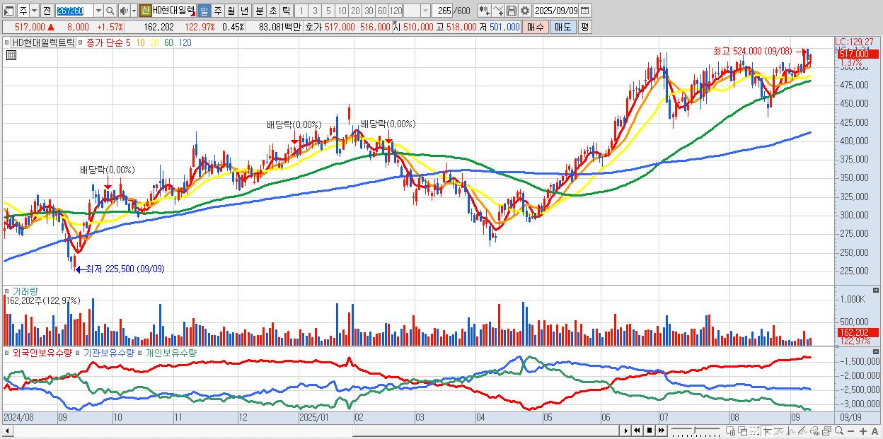 - HD현대일렉트릭 (516,000원 ▲ 1.38% , 시총: 186,003억, 외국인 순매수 거래금:95억)