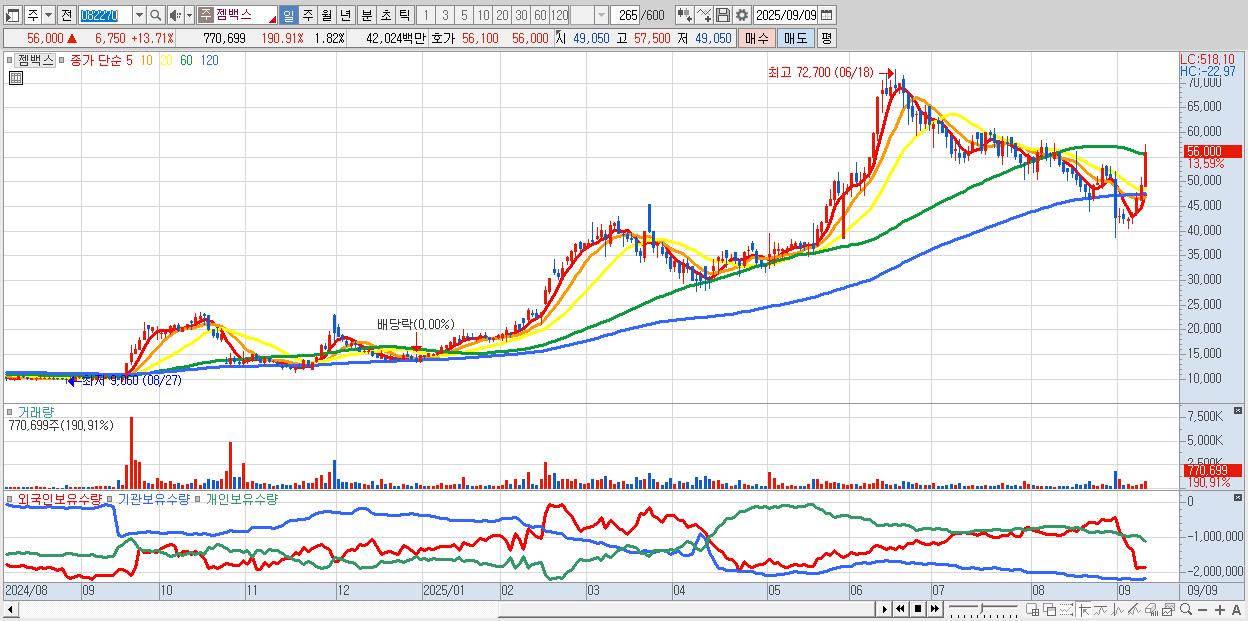 - 젬백스 (56,500원 ▲ 14.72% , 시총: 23,891억, 외국인 순매수 거래금:65억)