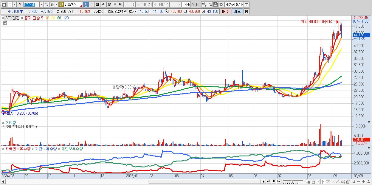 - STX엔진 (44,000원 ▼ -7.47% , 시총: 17,665억, 외국인 순매수 거래금:84억)