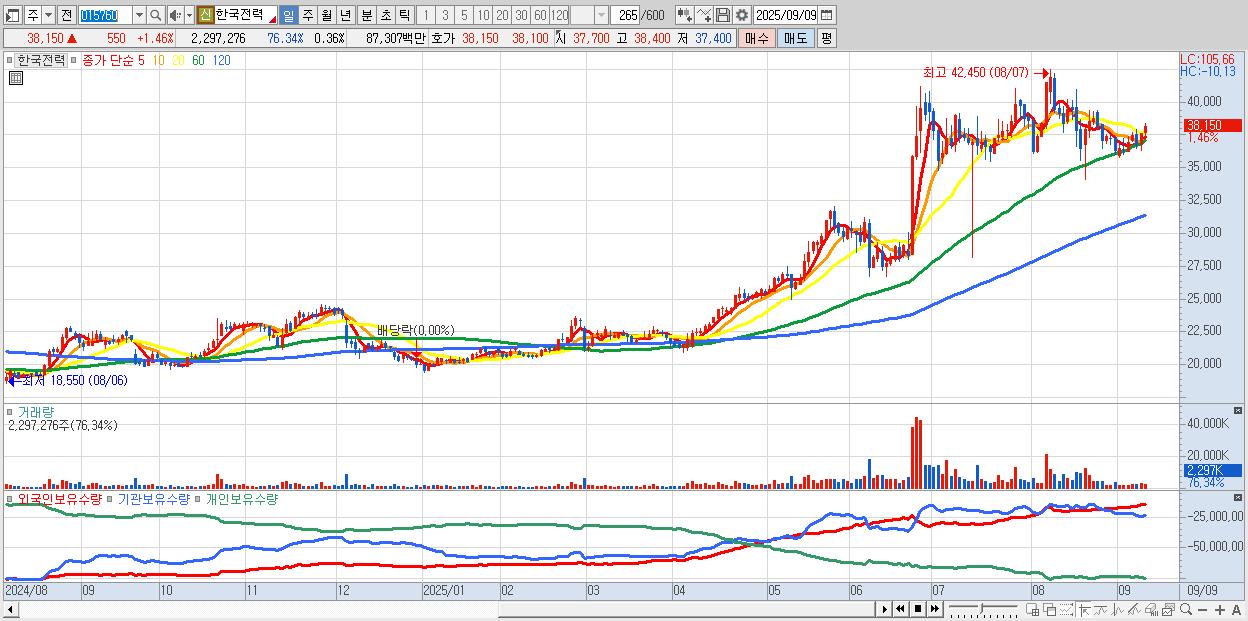 - 한국전력 (38,100원 ▲ 1.33% , 시총: 244,588억, 외국인 순매수 거래금:126억)