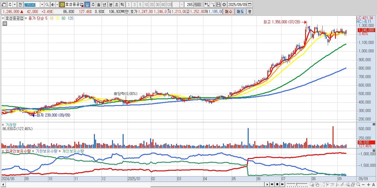 - 효성중공업 (1,252,000원 ▲ 3.99% , 시총: 116,743억, 외국인 순매수 거래금:455억)